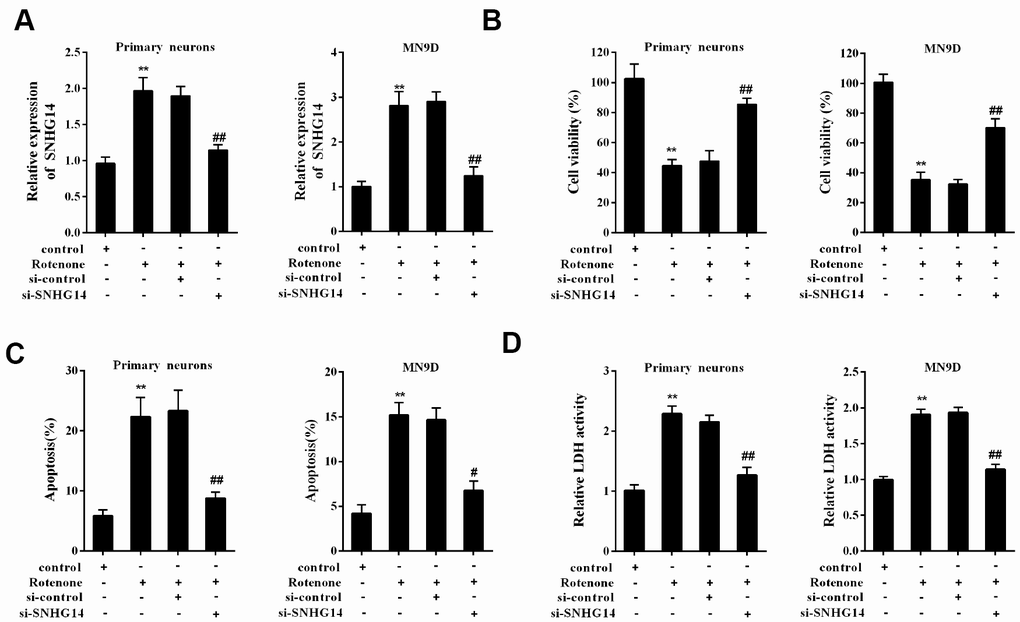 Basing on si-SNHG14 transfection or rotenone (1μmol/L) treatment, primary mesencephalic neurons, which were isolated from mice, were divided into 4 groups: control, Rotenone, Rotenone+si-control, and Rotenone+si-SNHG14. The upregulation of SNHG14 expression was induced by rotenone in primary mesencephalic neurons, which was reversed with si-SNHG14 transfection (Figure 4A). Primary mesencephalic neurons activity was significantly inhibited by rotenone, but this inhibitory effect was reversed after si-SNHG14 transfection (Figure 4B). Numbers of apoptotic primary mesencephalic neurons induced by rotenone was reduced after si-SNHG14 transfection (Figure 4C). The LDH activity, which indicated the increase of cytotoxicity, was increased by rotenone but was inhibited by si-SNHG14 transfection in primary mesencephalic neurons (Figure 4D). In order to confirm the protective effect of si-SNHG14 in response to rotenone challenge more comprehensively, we replaced primary mesencephalic neurons with MN9D cells and repeated the above experiment. As shown in Figure 4A–4D, in MN9D cells, the stimulation of rotenone elevated the SNHG14 expression, decreased cell viability, induced cell apoptosis and increased cell cytotoxicity, while all these trends could be reversed by si-SNHG14 transfection. These findings revealed that interference of SNHG14 ameliorated neuron injury induced by rotenone.