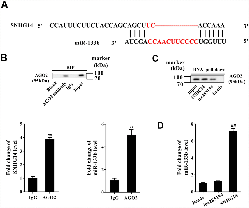 RIP assay was performed using EZ-Magna RIP RNA-Binding Protein Immunoprecipitation Kit (Merck Millipore, MO, USA) according to the manufacturer’s instruction. MN9D cell lysate was prepared by 1.5×107 cells using 100 μl RIP lysis buffer containing 0.25 μl RNase inhibitor and 0.5 μl protease inhibitor. The lysate was incubated with protein A/G magnetic beads conjugated to AGO2 antibody or normal mouse IgG. Subsequently, RNA-binding protein complex was obtained. IP-western was used to assess AGO2 protein level, and qRT-PCR was used to detect lncRNA SNHG14 and miR-133b.