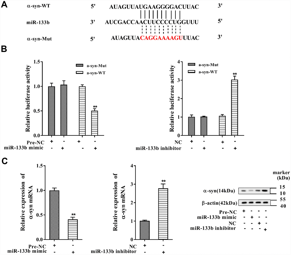 MicroRNA-133b has been identified to be specifically expressed in midbrain DA neurons and to be deficient in midbrain tissue from patients with PD [13]; and serum miR-133b expression levels were significantly decreased in PD patients [14]. Moreover, ameliorative effect of miR-133b on axon degeneration induced by neurotoxin MPP+ has been discussed [15]. These findings powerfully proved that miR-133b is closely related to the development of PD. The complementary binding sites between miR-133b and the 3′-UTR of the gene encodes α-syn, SNCA, were predicted with bioinformatics analysis, implying the potential interaction between them in DA neurons.