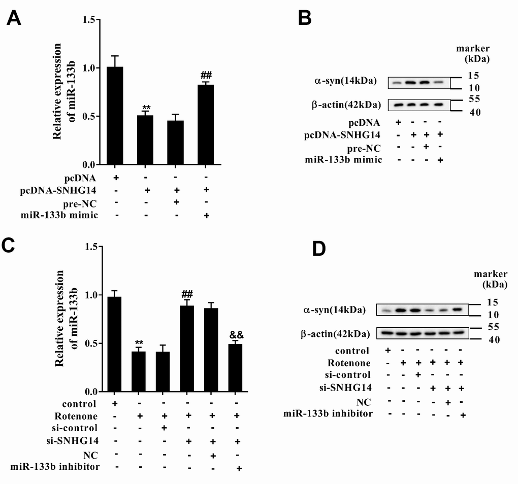 Afterwards, MN9D cells were assigned into 4 groups: pcDNA, pcDNA-SNHG14, pcDNA-SNHG14+pre-NC, and pcDNA-SNHG14+miR-133b mimic. Compared with pcDNA, over-expression of SNHG14 after pcDNA- SNHG14 transfection decreased miR-133b level, which was reversed by miR-133b mimic (Figure 7A); while the alteration of α-syn level in each group was just on the opposite with that of miR-133b (Figure 7B). MN9D cells were then divided into another 6 groups: control, Rotenone, Ro+ si-control, Ro+si-SNHG14, Ro+si-SNHG14+NC, and Ro+si-SNHG14+miR-133b inhibitor. The results indicated that rotenone lowered miR-133b level, which was reversed with interference of SNHG14, but miR-133b expression was finally repressed by miR-133b inhibitor (Figure 7C). On the contrary, α-syn protein expression was elevated after rotenone treatment but reduced with SNHG14 interfered, which was terminally boosted by miR-133b inhibitor (Figure 7D). We demonstrated that SNHG14 regulated α-syn expression via miR-133b.