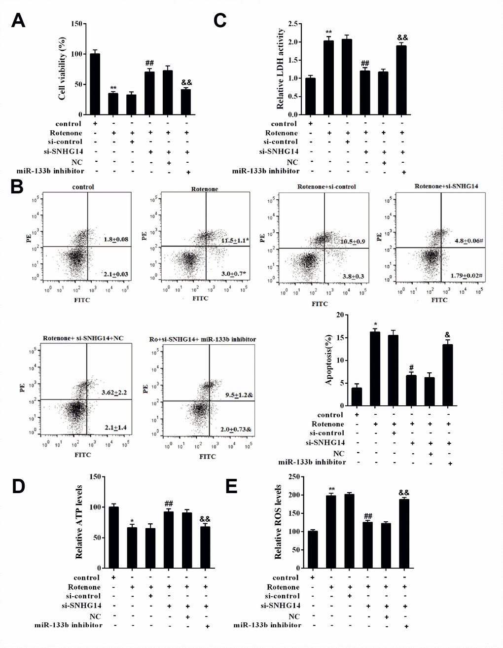 MN9D cells were divided into 6 groups: control, Rotenone, Rotenone+si-control, Rotenone+si-SNHG14, Rotenone+si-SNHG14+NC, and Rotenone+si-SNHG14+miR-133b inhibitor. Figure 8A displayed that cells activity was significantly inhibited by rotenone but enhanced after si-SNHG14 transfection, which was terminally repressed by miR-133b inhibitor. Neuron apoptosis (Figure 8B) and LDH activity (Figure 8C) were promoted by rotenone but suppressed by SNHG14 down-regulation, but they were both augmented by miR-133b inhibitor. Because the rotenone is an inhibitor of mitochondrial complex, to elaborate the effect of SNHG14/miR-133b pathway on mitochondrial function, we detected the level of ATP and ROS in rotenone–treated MN9D cells. As shown in Figure 8D–8E, the silencing of SNHG14 alleviated the rotenone-induced ATP synthesis reduction and ROS production increase, while miR-133b inhibitor reversed the effect of si-SNHG14. It could be concluded that interference of SNHG14 improved rotenone-damaged neuron activity through miR-133b.