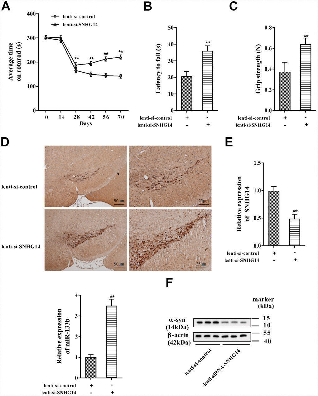 To validate the influence of SNHG14 interference on PD progression in vivo, PD mice (n=7 in each group) were injected with lenti-si-control or lenti-si-SNHG14, and the PD pathological characteristics were analyzed. As shown in Figure 9A, the average time on rotarod was dramatically prolonged in PD mice injected with lenti-si-SNHG14 than that in its control group, and the muscle strength of PD mice was notably improved (Figure 9B), as well as the grip strength (Figure 9C). The immunohistochemistry staining of brain tissues illustrated that the DA neuron loss in PD mice was remarkably improved after SNHG14 silence (Figure 9D). Meanwhile, lenti-si-SNHG14 injection effectively down-regulated the expression of SNHG14 in the brain tissue of PD mice, but it remarkably enhanced miR-133b expression (Figure 9E). Inversely, compared with the lenti-si-control group, the α-syn protein levels were clearly diminished in PD mice injected with lenti-si-SNHG14 (Figure 9F). Our findings verified that down-regulated SNHG14 mitigated neuron injury in PD mouse model.
