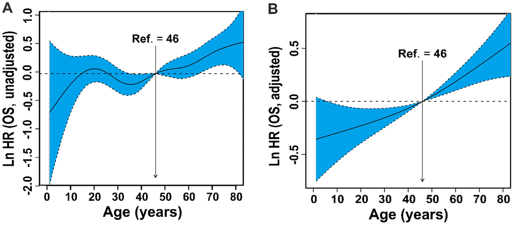 To quantify the prognostic effect, patient age as a continuous variable was entered into the Cox proportional hazards regression using P-splines in smoothHR to allow for a nonlinear relationship between age and OS. The risk (lnHR) of mortality increased steadily with increasing age (Figure 2A). After adjusting for covariates (PS, stage, LDH, PTI, and B symptoms), a similar trend in age and mortality was found (Figure 2B).