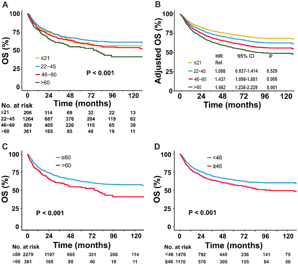 Significant differences in survival were observed between age groups after dichotomizing the data using a cutoff of 60 or 46 years. The unadjusted 5-year OS rates for the ≤60 versus >60 groups were 62.5% versus 54.8%, respectively (Figure 3C) and for the <46 versus ≥46 groups, the rates were 64.3% versus 57.8%, respectively (Figure 3D). After adjustment for all covariates, the adjusted OS remained significantly different between the two age groups (data not shown).