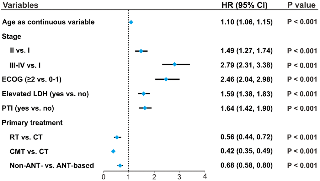 Patients’ age as a continuous variable had a significant independent association with OS (HR, 1.10; 95% CI, 1.06–1.15) after adjusting for covariates and treatments (Figure 4). Other clinical factors, including stage, PS, LDH, and PTI significantly influenced OS. Compared with CT only, RT (HR, 0.56; 95% CI, 0.44–0.72) and CMT (HR, 0.42; 95% CI, 0.35–0.49) significantly decreased the risk of mortality. Non-ANT-based CT was associated with a significant improvement in OS compared with ANT-based CT (HR, 0.68; 95% CI, 0.58–0.80), indicating age, as a continuous variable, was an independent prognostic factor for OS, regardless of primary treatment.