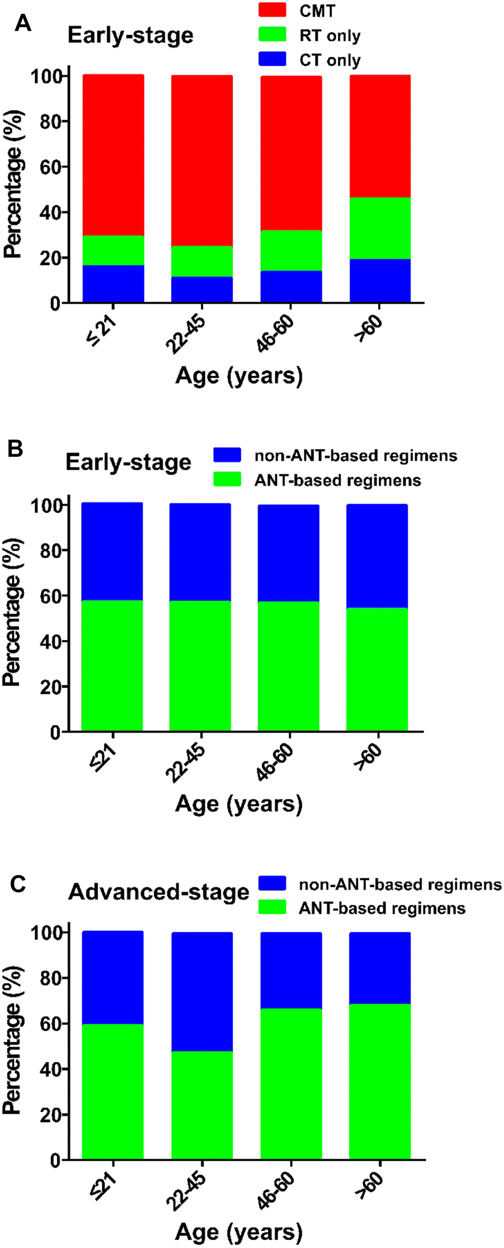 Elderly early-stage patients were significantly more likely to receive RT only (24.7% age >60 versus 10.2% age ≤21; Figure 5A). No significant difference was found between non-ANT-based and ANT-based regimens in early-stage patients treated with CMT (Figure 5B). Young-adult, advanced-stage patients (22–45 years-old) tended to receive the non-ANT-based regimen, compared with the other age groups (65.5% versus approximately 50%, P < 0.05; Figure 5C).