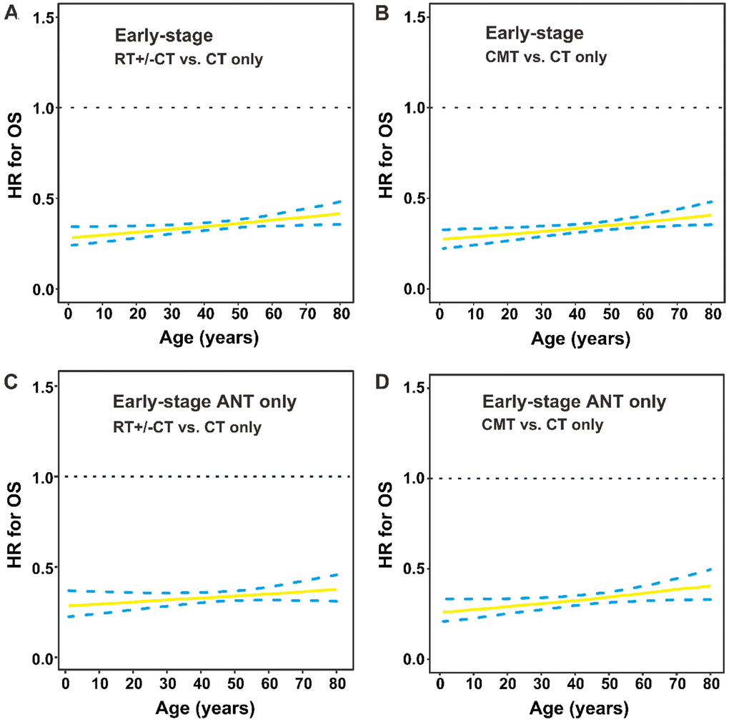 The HR for OS after RT versus CT only was plotted when age was defined as a continuous variable in early-stage patients. Compared with CT only, RT (with or without CT) significantly decreased the risk of mortality in early-stage patients of all ages (HR for the entire group: 0.347, 95% CI, 0.287–0.420; Figure 6A). The performance of CMT compared with CT only also improved significantly among patients of all ages (HR, 0.339; 95% CI, 0.279–0.412; Figure 6B), indicating RT’s survival benefit was independent of age with early-stage disease. Similarly, for patients who received ANT-based CT, we also found a significant difference between RT+/-CT and CT only (HR, 0.333; 95% CI, 0.262–0.422; Figure 6C), CMT and CT only (HR, 0.328; 95% CI, 0.256–0.420; Figure 6D).