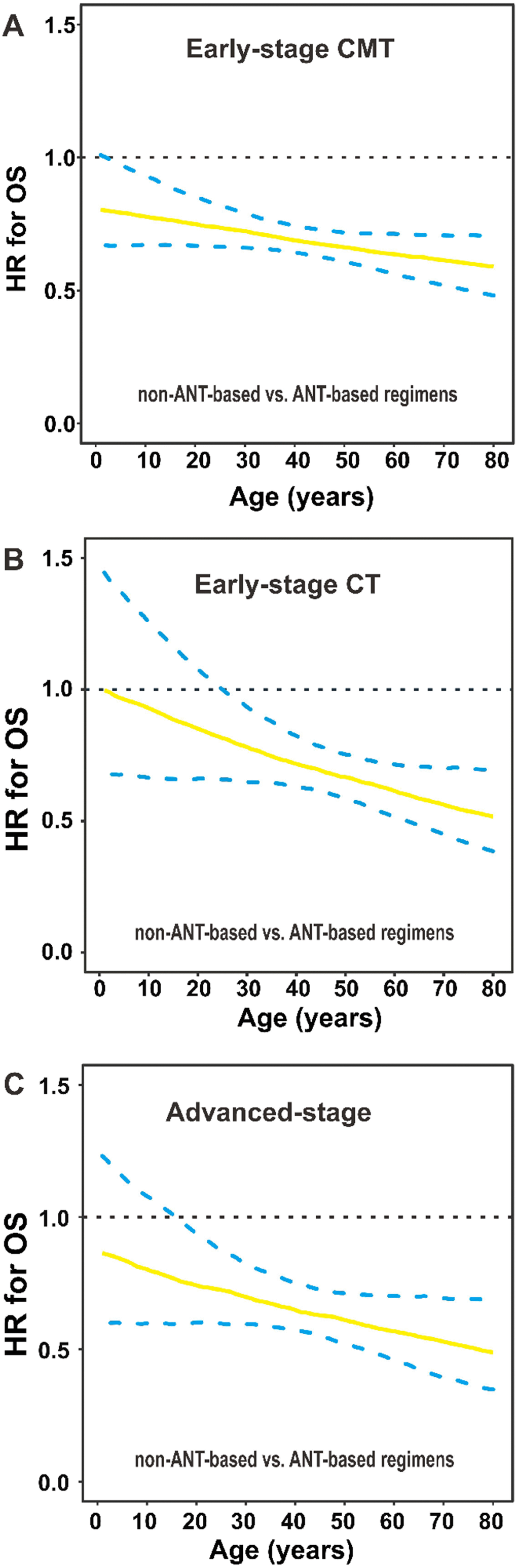 For early-stage patients receiving CMT, non-ANT-based regimen significantly decreased the risk of mortality compared with ANT-based regimen (HR for the entire group: 0.690; 95% CI, 0.553–0.860; Figure 7A). Furthermore, for early-stage patients receiving CT, there was a marginally significant difference between non-ANT-based and ANT-based regimens (HR for the entire group: 0.694; 95% CI, 0.476–1.013; Figure 7B). For advanced-stage patients, non-ANT-based CT significantly improved OS compared with ANT-based CT (HR for the entire group: 0.678; 95% CI, 0.463–0.992; Figure 7C). The relative performance of the non-ANT-based regimen compared with the ANT-based regimen improved with increasing age. This finding indicated the survival benefit of the non-ANT-based regimen was independent of age.