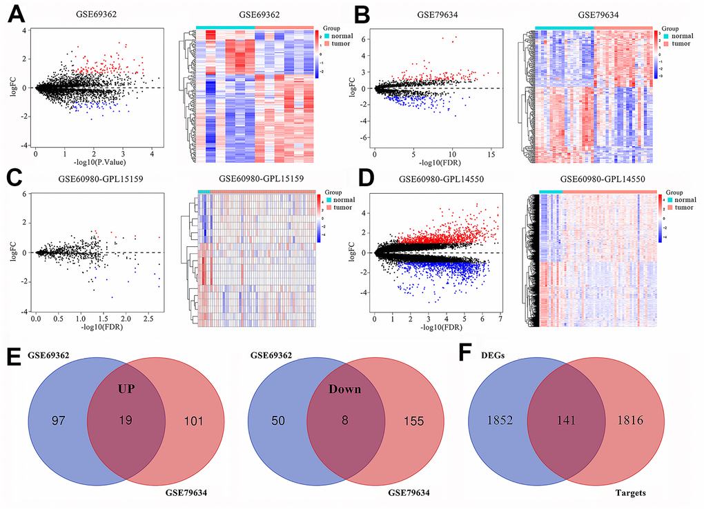 We normalized the expression of circRNAs (Supplementary Figures 1A and 1B), microRNAs and mRNAs (Supplementary Figures 1C and 1D) in PAAD and normal pancreatic tissues. We identified 457 differentially expressed circRNAs (DEcircRNAs), which included 174 in the GSE69362 dataset [15] and 283 in the GSE79634 dataset [16], based on a threshold of P value < 0.05 and |log FC| ≥ 1. We generated volcano plots and heatmaps of the DEcircRNAs (Figures 1A and 1B), 19 DEmiRNAs (7 up-regulated and 12 down-regulated; Figure 1C) and 1993 DEmRNAs (1012 up-regulated and 981 down-regulated; Figure 1D) to demonstrate their aberrant expression in PAAD tissues. We compared the DEcircRNAs from the two datasets and identified 19 up-regulated and 8 down-regulated DEcircRNAs for further analysis (Figure 1E).