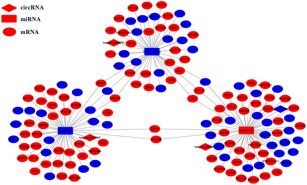 We analyzed the DEcircRNAs, DEmiRNAs and DEmRNAs using the CSCD database and identified circRNA-miRNA pairs. We also identified miRNA-mRNA pairs by analyzing the miRDB, miRTarBase and TargetScan databases (Figure 1F). Finally, we generated a ceRNA network that consisted of 4 DEcircRNAs (circ-HIBADH, circ-UBAP2, circ-TADA2A and circ-CLEC17A), 3 DEmiRNAs (has-miR-214, has-mir-324-3pandhas-miR-494) and 149 DEmRNAs using the Cytoscape software as shown in Figure 2. The basic characteristics of the 4 DEcircRNAs are shown in Table 1 and Figure 3. Furthermore, we found that circ-CLEC17A is aberrantly overexpressed in PAAD tissues from females compared to males (Supplementary Figures 2A–2D).