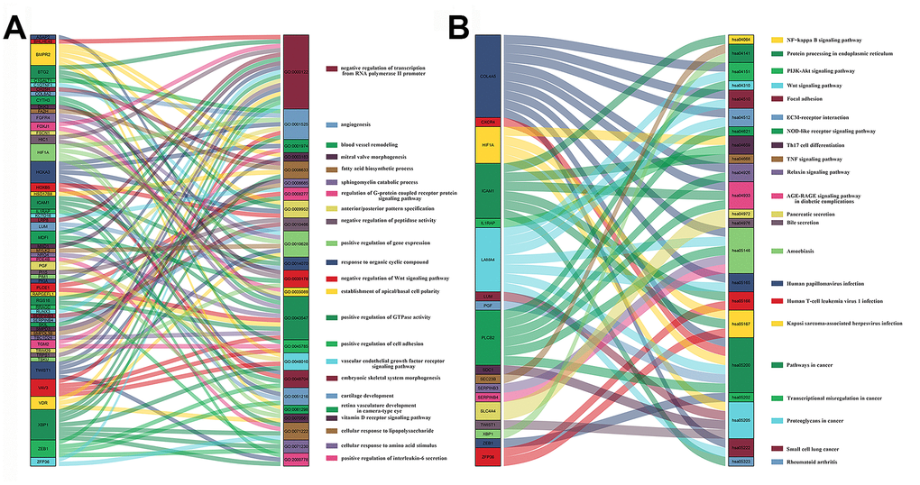 We performed Gene ontology (GO) and Kyoto Encyclopedia of Genes and Genomes (KEGG) analyses of the DEmRNAs to identify aberrantly regulated biological processes and signaling pathways in PAAD. The Gene Ontology analyses suggested that biological processes such as cell proliferation, angiogenesis and negative regulation of transcription from RNA polymerase II promoter were dysregulated (Figure 4A). KEGG pathway analysis of DEmRNAs highlighted the involvement of the NF-kappa B, PI3K-Akt, and Wnt signaling pathways, and cancer-related dysregulation of transcription (Figure 4B). The NF-kappa B, PI3K-Akt, and Wnt signaling pathways have previously been implicated in the growth and progression of PAAD [17–19]. The Sankey plots for all the enriched GO terms and KEGG pathways with a P value < 0.05 were shown, further highlighting the genes and the pathways involved in PAAD.