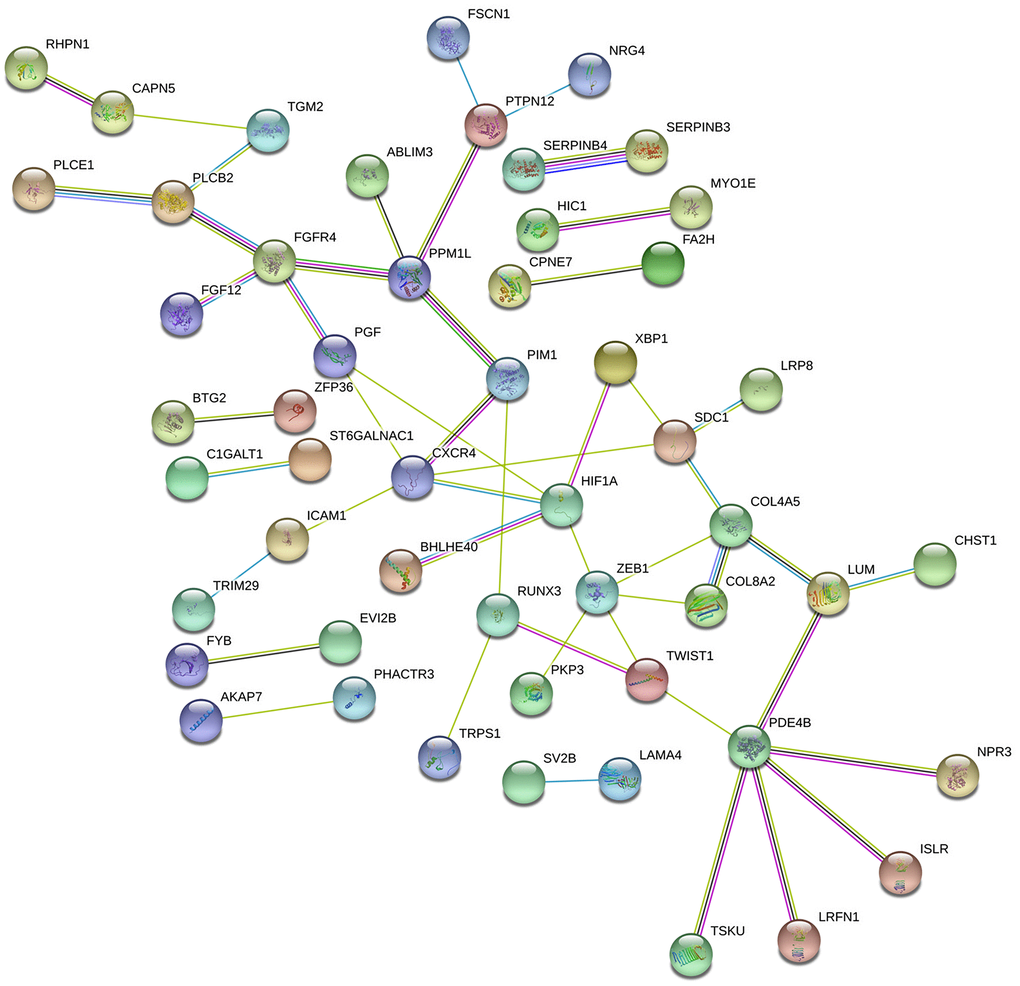 We analyzed the DEmRNAs using the Search Tool for the Retrieval of Interacting Genes database (STRING) and constructed a protein-protein interaction (PPI) network consisting of 141 nodes and 50 edges (Figure 5). We identified the top 15 genes, which were found in at least 6/11 topological algorithms and had a high-ranking score. After integrating the results of the GO, KEGG and PPI network analyses, we identified 5 hub genes that were closely related to PAAD tumorigenesis, namely, C-X-C Motif Chemokine Receptor 4 (CXCR4), Hypoxia-Inducible Factor 1 Subunit Alpha (HIF1A), Zinc Finger E-Box Binding Homeobox 1 (ZEB1), Syndecan 1 (SDC1) and Twist Family BHLH Transcription Factor 1 (TWIST1).