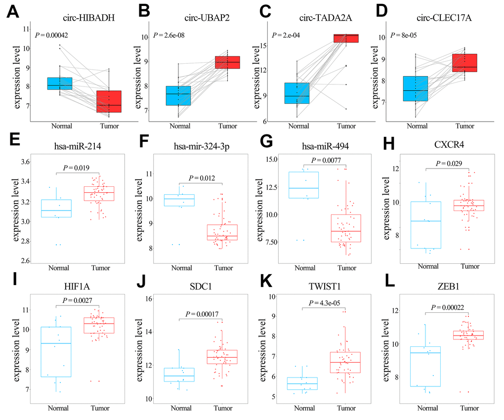 We analyzed the relative importance of the DEmRNAs using the STRING database (https://string-db.org/) [47], which contains 9,643,763 proteins from 2,031 organisms and 1,380,838,440 interactions. We constructed the PPI network using the Cytoscape software. The genes were ranked using the cytoHubba plug-in in Cytoscape [48]. We identified the hub genes by integrating the results of the GO, KEGG and PPI network analyses. The expression of 4 circRNAs (circ-HIBADH, circ-UBAP2, circ-TADA2A, and circ-CLEC17A), 3 miRNAs (has-miR-214, has-mir-324-3p, and has-miR-494) and 5 hub genes (CXCR4,HIF1A, ZEB1, SDC1 and TWIST1) were compared between the PAAD and the normal pancreatic tissues from the GEO dataset. The GEPIA (http://gepia.cancer-pku.cn/) [49] and THPA database (https://www.proteinatlas.org) [50] were used to validate the transcript (mRNA) and the protein levels of the hub genes. Differentially expressed genes were identified by applying the criteria of |log 2 FC| > 1 and P value < 0.05. Moreover, we compared the expression of the four circRNAs in men and women using the GSE79634 database that provides gender-based information for PAAD patients.