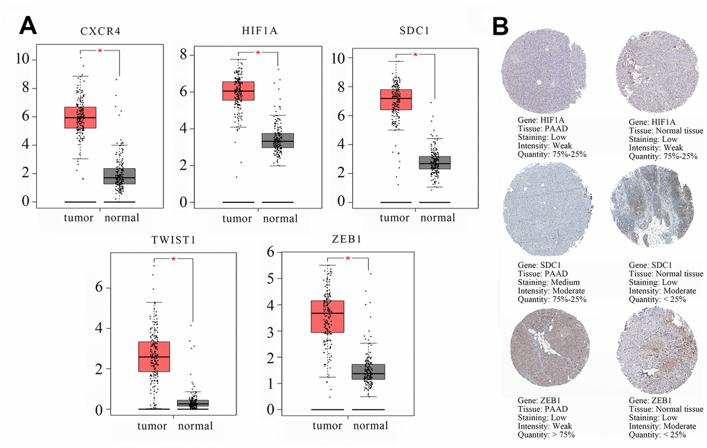 The transcription levels of the 5 hub genes in GSE60980 (GPL14550), 3 related miRNAs in GSE60980 (GPL15159), and 4 circRNAs in GSE79634 (Figure 6) and GSE69362 (Supplementary Figure 3) were shown. We further validated the 5 hub genes by analyzing their mRNA expression in the Gene Expression Profiling Interactive Analysis (GEPIA) and the protein expression in The Human Protein Atlas (THPA) database as shown in Figures 7A and 7B, respectively. The transcription levels of these 5 hub genes in GEPIA were similar to the results in Figure 6. The protein expression data in the THPA database showed that SDC1 and ZEB1 were aberrantly overexpressed in PAAD compared to normal pancreatic tissues, which were in accordance with our transcription results in Figure 6. However, HIF1A protein levels were low in both PAAD and normal pancreatic tissues, and the protein levels of the remaining two hub proteins, CXCR4 and TWIST1 were not found in the THPA database.