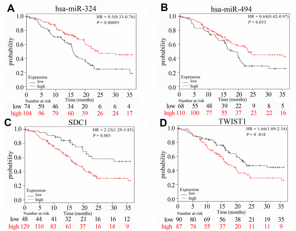 We analyzed the overall survival (OS) using the Kaplan-Meier Plotter database (KM plotter database) to determine the prognostic value of hub genes and miRNAs. Prognosis based on their high and low expression in PAAD tissues is shown in Figure 8. High expression of SDC1 and TWIST1 was associated with poorer OS (HR = 2.23, P = 0.0030 and HR = 1.66, P = 0.018). High expression of hsa-miR-494 and hsa-miR-324 was associated with increased OS (HR = 0.64, P = 0.033 and HR = 0.50, P = 0.00095).