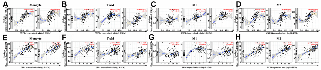 The expression of specific markers for TAMs, M2 macrophages, monocytes and Tregs show a moderate to strong positive correlation with the expression of CXCR4 and ZEB1 (Table 2). These include TAM markers such as CCL-2, CD68 and IL10, and M2 phenotype markers such as CD163, VSIG4 and MS4A4A (Figure 9A–9H). Furthermore, the expression of specific markers for CD8+ T cells, T cells (general) and B cells show a strong positive correlation with the expression of CXCR4 (Table 2). The high expression of DC markers, HLA-DPB1, HLA-DQB1, HLA-DRA, HLA-DPA1, BDCA-1, BDCA-4 and CD11c correlates with increased expression of CXCR4 (P <0.001) and ZEB1 (P <0.001) (Table 2). This suggests that PAAD cells expressing high levels of CXCR4 and ZEB1 proteins might promote DC infiltration. We also observed positive correlation between CXCR4 and markers of T cell exhaustion, such as programmed cell death protein 1 (PD-1), cytotoxic T lymphocyte-associated antigen-4 (CTLA4), lymphocyte-activation gene 3 (LAG3), T cell immunoglobulin domain and mucin domain-3 (TIM-3), and Granzyme B (GZMB) (P <0.001) (Table 2).