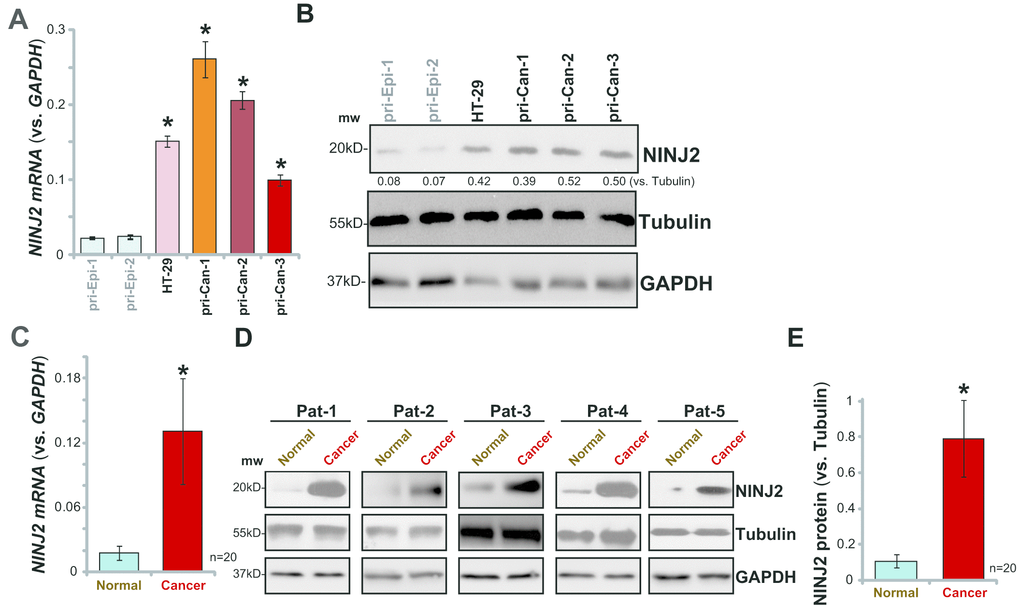 NINJ2 mRNA levels in a total of twenty (20) human colon cancer tissues (“Cancer”) and paracancer normal colon epithelial tissues (“Normal”) were analyzed. As shown, NINJ2 mRNA levels were significantly upregulated in the colon cancer tissues (Figure 1C). Its levels were low in colon epithelial tissues (Figure 1C). Western blotting analyses confirmed significant NINJ2 protein upregulation in cancer tissues (representative tissues from five independent patients were shown, Figure 1D). Quantitative analyses of blotting results of all twenty pairs of tissues confirmed that NINJ2 protein levels are significantly higher in colon cancer tissues (P< 0.05 vs. colon epithelial tissues, Figure 1E). Together, these results show that NINJ2 is upregulated in human CRC cells and tissues.
