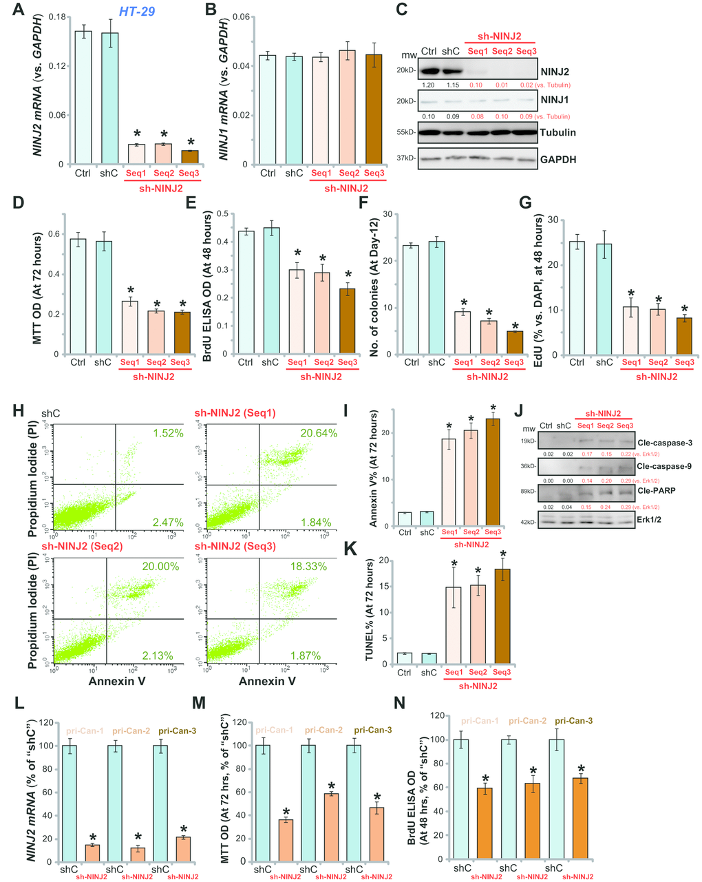 Cell apoptosis was tested as well. As demonstrated, each of the applied NINJ2 shRNA (“Seq1/2/3”) increased the percentage of Annexin V-positive HT-29 cells (Figure 2H and 2I). NINJ2 silencing induced cleavages of caspase-3, caspase-9 and PARP in HT-29 cells (Figure 2J). Furthermore, in NINJ2-silenced HT-29 cells, the TUNEL percentage (% vs. DAPI) was increased (Figure 2K). These results show that NINJ2 knockdown by targeted shRNA induced viability reduction, proliferation inhibition and apoptosis activation in HT-29 cells. The non-sense scramble control shRNA (“shC”) had no significant effect on NINJ1/NINJ2 expression (Figure 2A–2C) and HT-29 cell function (Figure 2D–2K).