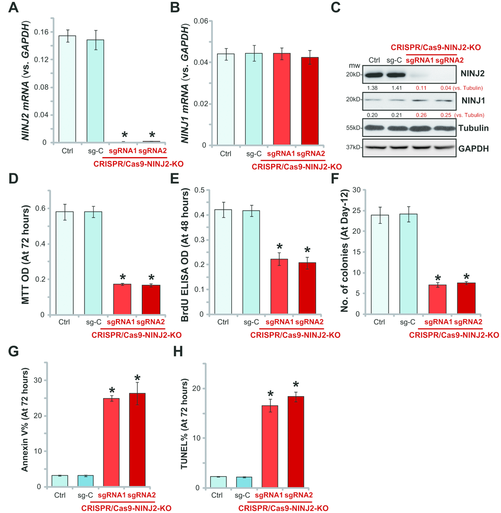 Significantly, NINJ2 depletion by the CRISPR/Cas9-KO construct potently inhibited the viability of HT-29 cells, showing significantly decreased MTT ODs (Figure 3D). Furthermore, BrdU ELISA assay and soft agar colony formation assay results demonstrated that proliferation of the NINJ2-knockout cells was inhibited as well (Figure 3E and 3F). Furthermore, the NINJ2-knockout cells showed increased Annexin V percentage (Figure 3G) and TUNEL ratio (Figure 3H), indicating apoptosis activation. Together, these results show that CRISPR/Cas9-mediated NINJ2 knockout inhibited survival and proliferation of HT-29 cells. Notably, the lenti-CRISPR/Cas9 construct with the non-sense control sgRNA (“sg-C”) did not change NINJ1/NINJ2 expression (Figure 3A–3C) and HT-29 cell functions (Figure 3D–3H).