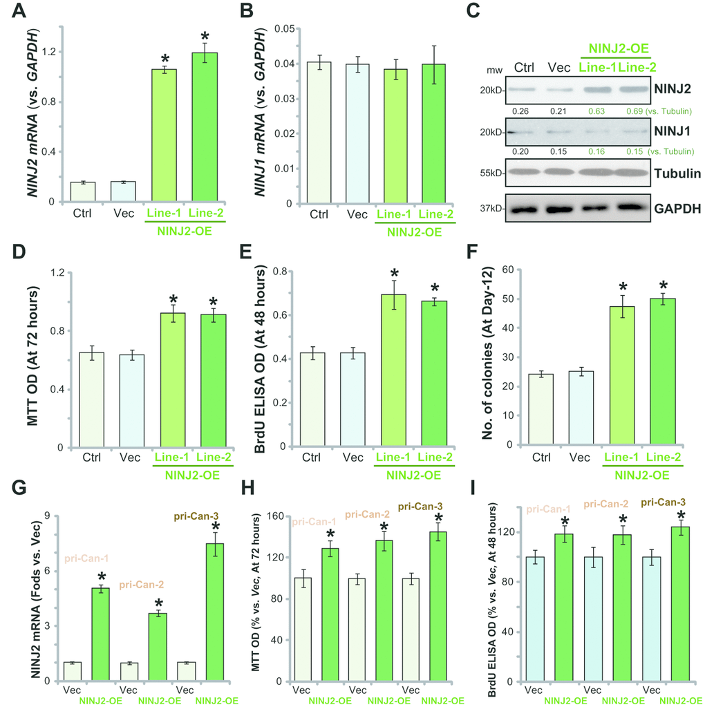 As compared to the vector control cells (“Vec”), NINJ2-OE HT-29 cells showed significantly increased viability (MTT OD, Figure 4D), BrdU incorporation (Figure 4E) and colony formation (Figure 4F). Similar results were obtained in the primary human colon cancer cells (“pri-Can-1/-2/-3”), where lentivirus-mediated overexpression of NINJ2 (“NINJ2-OE”, Figure 4G) increased MTT OD (Figure 4H) and BrdU incorporation (Figure 4I). These results confirmed that ectopic NINJ2 overexpression promoted CRC cell survival and proliferation.