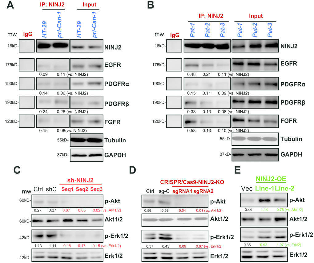 Simultaneous activation of multiple RTKs will induce persistent activation of downstream PI3K-Akt-mTOR and Erk-MAPK signalings, leading to CRC oncogenesis and progression [9, 10]. Several of these RTKs, including EGFR (epidermal growth factor receptor) [11], PDGFRα(platelet-derived growth factor receptor α), PDGFRβ and FGFR (fibroblast growth factor receptor), are important oncogenes of CRC [9, 10]. NINJ2 is a novel adhesion molecule located on the cell surface [6, 7]. To test if there is a possible interaction between NINJ2 and cell surface RTKs in CRC cells, co-immunoprecipitation (co-IP) assay was performed. As shown, in both HT-29 cells and primary human colon cancer cells (“pri-Can-1”), NINJ2 co-immunoprecipitated with EGFR, PDGFRα, PDGFRβ and FGFR (Figure 5A). NINJ2 associations with these RTKs were also detected in fresh human colon cancer tissue lysates (Figure 5B). Thus, NINJ2 could possibly form a complex with multiple RTKs in CRC cells and human colon cancer tissues.
