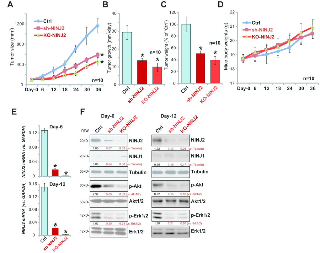To analyzing signaling changes, at recording “Day-6” and “Day-12”, one tumor of each group was separated. The total six tumors were homogenized in the tissue lysis buffer. qPCR assay results confirmed that, as compared to the control tumors, NINJ2 mRNA levels were significantly downregulated in sh-NINJ2 HT-29 xenografts (Figure 6E), and its levels were further reduced in the KO-NINJ2 xenografts (Figure 6E). NINJ2 protein levels were also significantly downregulated in sh-NINJ2- and KO-NINJ2-xenografts (as compared to control tumors, Figure 6F). Importantly, p-Akt and p-Erk1/2 levels were also largely inhibited in sh-NINJ2- and KO-NINJ2-tumor tissues (Figure 6F). Therefore, in line with the in vitro findings, NINJ2 silencing or depletion inhibited Akt-Erk activation in HT-29 xenograft tissues.