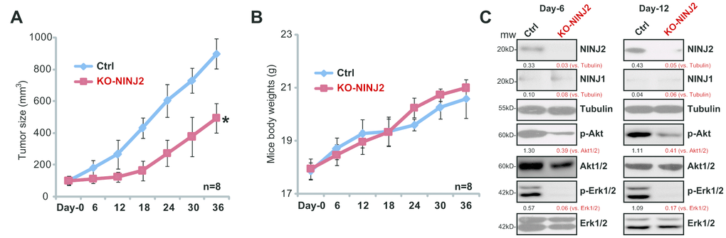 The potential effect of NINJ2 on CRC cell progression in vivo was tested. Using a previously-described xenograft SCID mouse model [12], NINJ2 shRNA (“Seq3”)-expressing HT-29 cells (“sh-NINJ2”), NINJ2-knockout HT-29 cells (“KO-NINJ2”, using “sgRNA2”) as well as the parental control HT-29 cells (“Ctrl”) were s.c. inoculated to the flanks of the SCID mice. Tumor xenografts were established within three weeks, when the volume of each tumor was close to 100 mm3 (marked as “Day-0”). Tumor recordings then started every six days for a total of 36 days. Tumor growth curve results demonstrated that sh-NINJ2 HT-29 xenografts and the KO-NINJ2 HT-29 xenografts grew significantly slower than the control HT-29 xenografts (Figure 6A). The estimated daily tumor growth was also calculated, using the following formula: (Tumor volume at Day-36 subtracting Tumor volume at Day-36)/36 (days). Results show that NINJ2 shRNA or NINJ2 knockout dramatically inhibited daily growth of HT-29 xenografts (Figure 6B). At day-36, tumors of all three groups were isolated and weighted individually. We show that sh-NINJ2- or KO-NINJ2-HT-29 xenografts weighted significantly lower than the control tumors (Figure 6C). Mice body weight was not significantly different from the three groups (Figure 6D). These results show that NINJ2 silencing or depletion inhibited HT-29 xenograft growth in SCID mice.