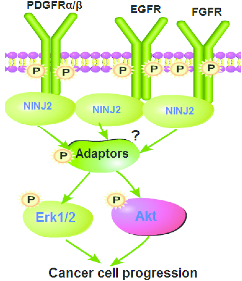 This current study implied an essential function of NINJ2 in mediating Akt and Erk activations by RTKs. NINJ2 co-immunoprecipitated with multiple RTKs (EGFR, PDGFRα/β and FGFR) in CRC cells and human colon cancer tissues. Importantly, downstream Akt and Erk activations were significantly inhibited by NINJ2 silencing or knockout, but augmented with ectopic NINJ2 overexpression. Therefore, NINJ2 could be a novel and key adaptor protein for multiple RTKs in CRC cells, mediating downstream Akt and Erk signaling activation (see proposed signaling pathway carton in Figure 8). Targeting NINJ2 can result in better efficiency in blocking downstream signaling activation, thus causing potent inhibition on CRC cells. The underlying signaling mechanisms, however, may warrant further characterizations.