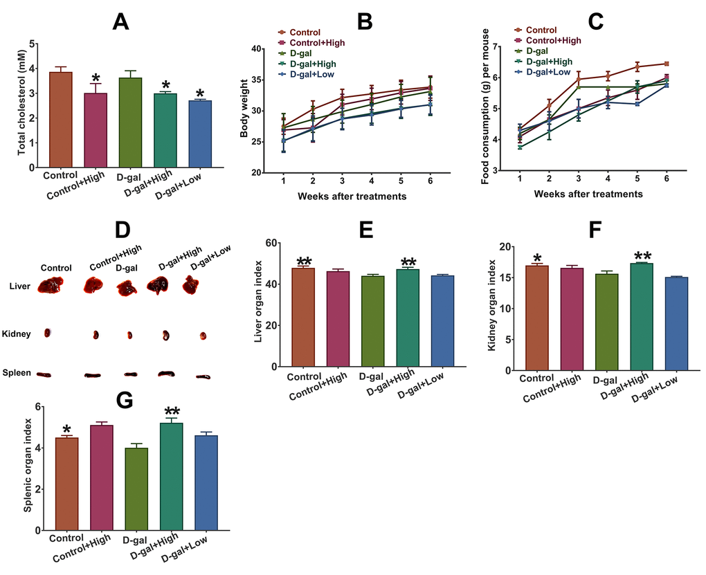 As shown in Figure 1A, the levels of total cholesterol (TC) in Prob-treated groups significantly decreased compared to Prob-untreated groups, indicating the hypocholesterolemic effect of Prob. The body weight and food consumption of each mouse were also observed during Prob treatment. The results showed that Prob treatment did not affect body weight and food consumption of mice, suggesting that Prob treatment did not affect the general appearance of mice (Figure 1B and 1C). Additionally, the organ indices of liver, spleen and kidney in D-gal group were significantly reduced compared to the control group, whereas, Prob treatment markedly reversed D-gal-induced decrease in organ indices, implying that Prob may prevent D-gal-triggered organ atrophy (Figure 1D–1F).