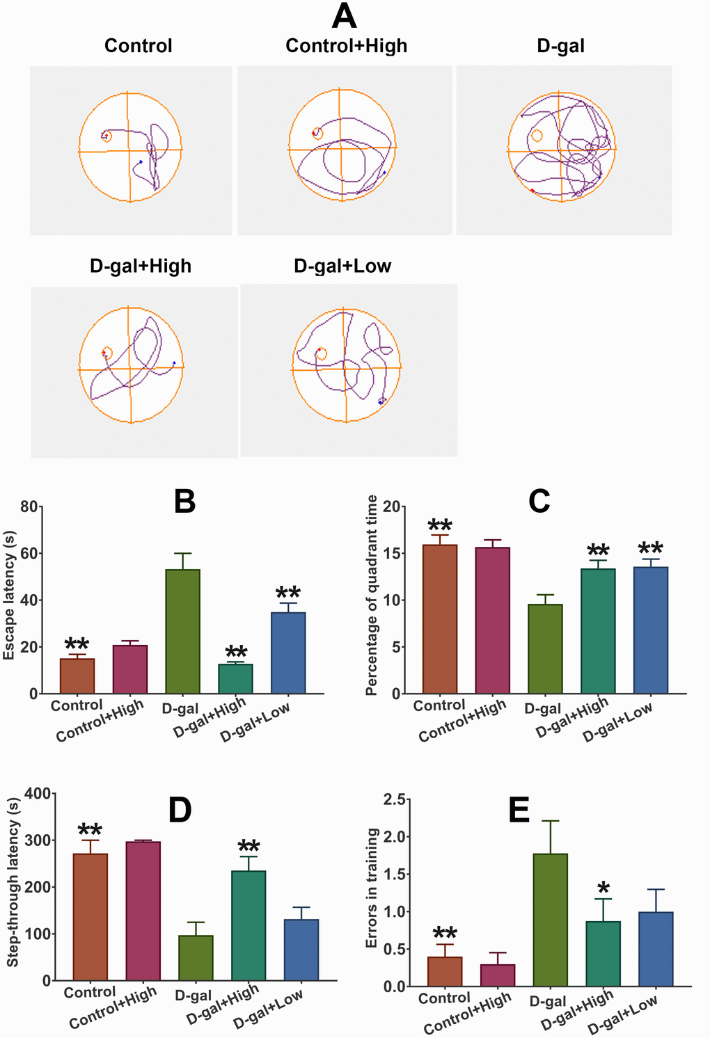 The spatial learning and memory was detected using MWM test. After four-day training, escape latency and percentage of time in the target quadrant on day 5 were recorded. As illustrated in Figure 2A and 2B, escape latency in D-gal was markedly longer than that in the control group, while the percentage of quadrant time significantly increased in the control group than that in the D-gal group, indicating the impaired cognitive function was induced by D-gal. Notably, Prob could remarkably shortened escape latency and prolong the quadrant time in the targeted quadrant of mice treated with D-gal (Figure 2A and 2B), implying that Prob holds the potential to improve learning and memory deficits induced by D-gal.