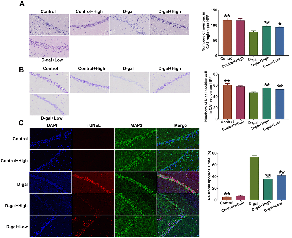 Neuronal numbers in the CA1 region were also evaluated using Nissl staining. The results revealed that the number of Nissl positive neurons in D-gal group was remarkably decreased compared with the control group, while Prob treatment inhibited the reduction of neuronal numbers induced by D-gal (Figure 3B), indicating that Prob could rescue neuronal loss in the CA1 region. Additionally, cell apoptosis of CA1 region in D-gal group was higher than that in the control group, while Prob treatment restrained D-gal-induced apoptosis (Figure 3C), suggesting the inhibitory role of Prob in neuronal apoptosis.