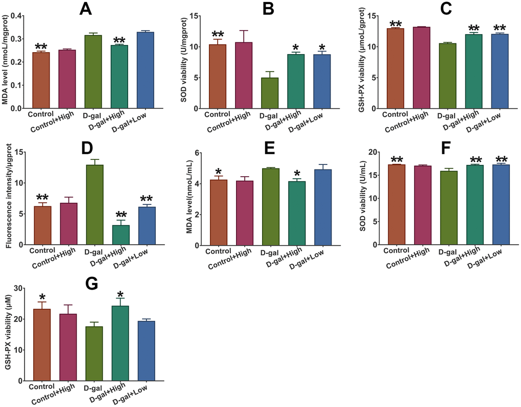 It has been confirmed that the aging process is characterized by changes in appearance, including significant decrease in organic atrophy caused by oxidative stress-induced apoptosis, which can be accelerated by the administration of D-gal [26]. In the present study, we found that the organ indices of liver, spleen and kidney in D-gal group were significantly reduced compared to control group, indicating chronic D-gal administration causes organ atrophy. Notably, Prob treatment significantly attenuate the decline in organ indices induced by D-gal, suggesting Prob has a prominent anti-aging effect in D-gal-induced aging model.