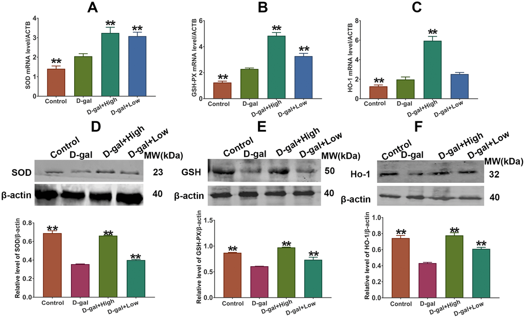As illustrated in Figure 5, the mRNA levels of cerebral SOD, GSH-PX and HO-1 in D-gal group were markedly higher than those in the control group. However, the protein levels and activities of SOD, GSH-PX and HO-1 in the brain were remarkably declined in D-gal group as compared to control group (Figure 5). Importantly, Prob treatment elevated mRNA and protein levels of cerebral SOD, GSH-PX and Ho-1 of D-gal-induced aging mice (Figure 5).