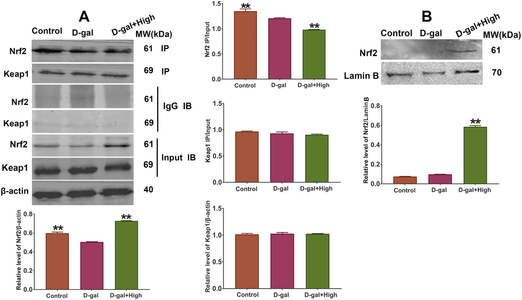 It has been well established that oxidative stress leads to the dissociation of Keap1/Nrf2 complex promoting Nrf2 to accumulate in the nucleus and activate gene expression of antioxidant enzymes, which in turn, ameliorates cellular oxidative stress. Thus, we investigated whether Prob has an impact on the dissociation of Keap1/Nrf2 complex. The results of Co-IP analysis showed that the ratio of ip/input of Nrf2 in D-gal group remarkably reduced as compared to control group (Figure 6A), indicating that D-gal promotes the uncoupling of Keap1/Nrf2 complex. Importantly, Prob treatment facilitated the dissociation of Keap1/Nrf2 complex as represented by a significant decrease in the ratio of ip/input of Prob group than D-gal group (Figure 6A). Additionally, the nuclear expression of Nrf2 in Prob group was markedly increased than that in D-gal group (Figure 6B), implying that Prob promotes dissociation of Keap1/Nrf2 complex leading to the accumulation of Nrf2 in nucleus.