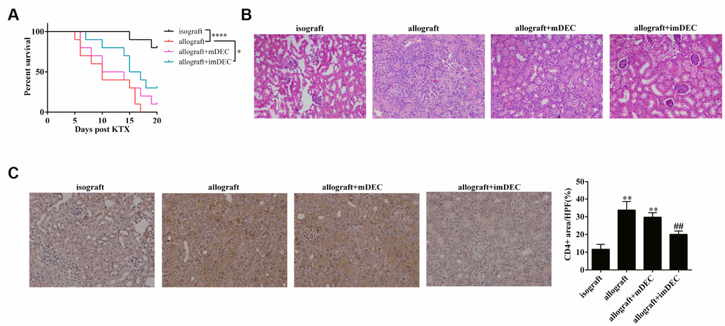 As shown in Figure 1A, the percent of survival in isograft mice was significantly higher than the allograft mice. The injection of imDECs significantly improved the percent of survival, whereas the injection of mDEC didn’t significantly change the percent of survival (Figure 1A). The median survival time of allograft group, allograft+mDEC group, and allograft+imDEC group was 10 d, 12 d, and 16 d (Figure 1A). H&E staining of kidney tissue showed that the inflammatory response was relieved in allograft+imDEC group compared with allograft group (Figure 1B). In addition, CD4 staining of kidney tissue showed that CD4+T cell infiltration was significantly reduced in allograft+imDEC group (Figure 1C). The percentage of CD4+ area was significantly decreased in allograft+imDEC group than allograft or allograft+mDEC group (Figure 1C). These findings indicated that the injection of imDEC relieved acute rejection after kidney transplantation.