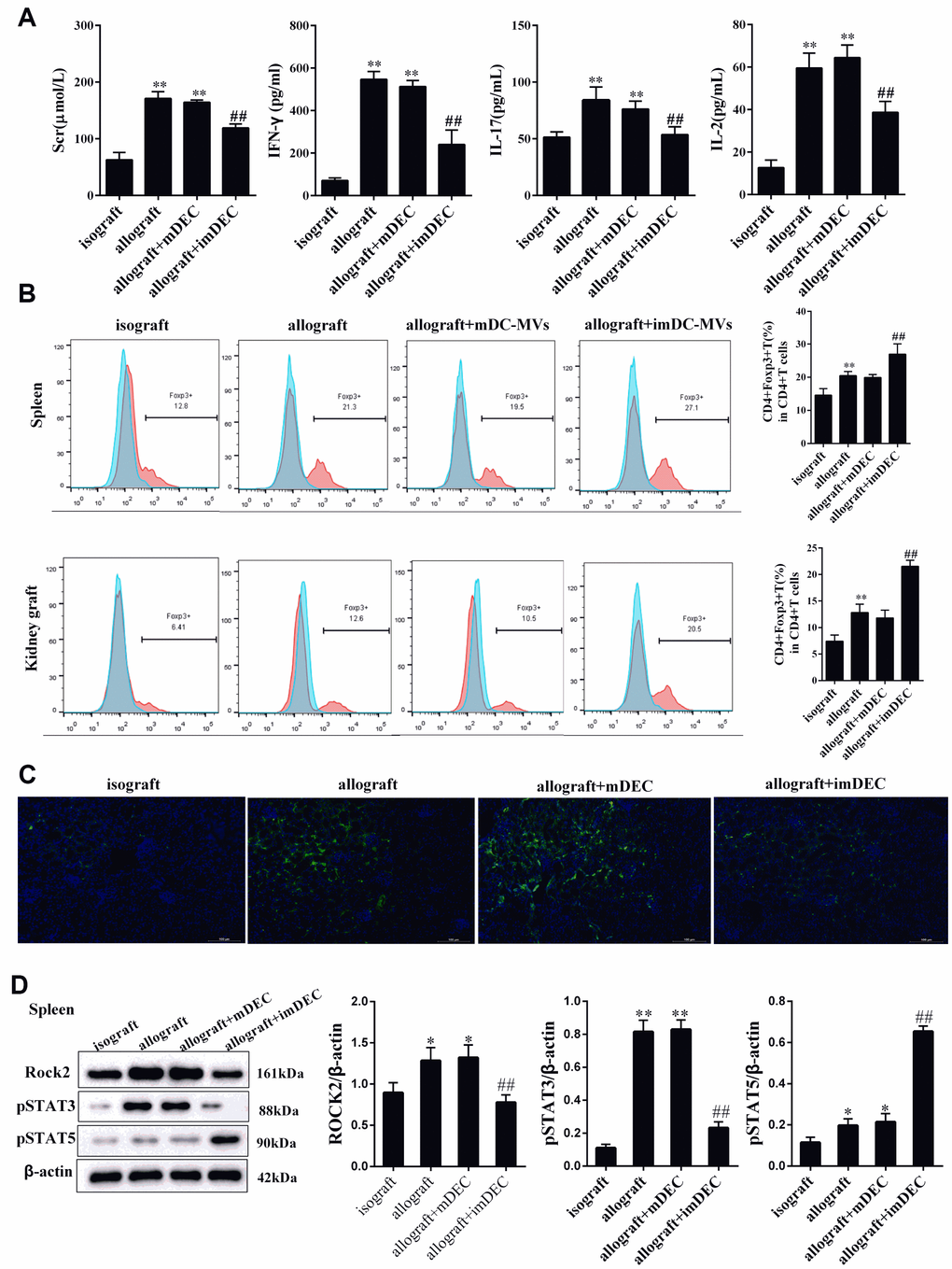 Cytokines are important mediators in the induction of immune response in kidney transplantation. Herein, the levels of rejection associated cytokines in the grafts of recipients were measured. We found renal function indicator serum Scr, and rejection associated cytokines IFN-γ, IL-2, IL-17 levels in plasma were significantly up-regulated in allograft mice than that of isograft mice (Figure 2A). And the injection of imDEC significantly reduced the rejection associated cytokines in allograft mice (Figure 2A). Compared with allograft group, the percentage of Foxp3+CD4+T cells in spleen and kidney tissues was significantly higher in allograft+imDEC group, whereas there was no significant change in the percentage of Foxp3+CD4+T cells between allograft+mDEC group and allograft group (Figure 2B). According to the immunofluorescence images, the expression of ROCK2 in allograft group was higher than isograft group, and the expression of ROCK2 in allograft+imDEC group was reduced than allograft group (Figure 2C). Next, we detected the ROCK2, STAT3, STAT5 expressions in the spleen. The expression of ROCK2 and p-STAT3 were significantly up-regulated in CD4+T cells from spleen of allograft mice, whereas p-STAT5 expression was significantly down-regulated in CD4+T cells from spleen of allograft mice (Figure 2D). The injection of imDEC could decrease the expression of ROCK2 and p-STAT3, and increase the expression of p-STAT5 (Figure 2D).
