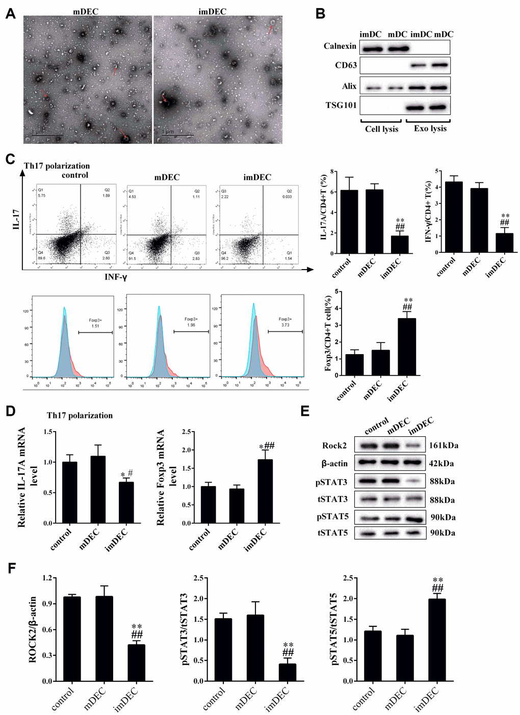As shown in Figure 3A and 3B, imDECs and mDECs from imDCs and mDCs were determined by transmission electron microscope or western blot. Calnexin was detected in cell lysis of imDCs and mDCs, whereas it was not detected in exo lysis of imDCs and mDCs (Figure 3B). In addition, exosome markers CD63, Alix and TSG101 were found in in exo lysis of imDCs and mDCs, whereas they were not found in cell lysis of imDCs and mDCs (Figure 3B). Next, we determined the effect of imDEC on the differentiation of IL17+CD4+T cells and Foxp3+CD4+T cells, and primary CD4+T cells were collected from the spleen. Under Th17 polarization condition, imDEC suppressed the percentage of IL17+CD4+T cells and IFN-γ+CD4+T cells, and promoted the percentage of Foxp3+CD4+T cells (Figure 3C). Besides, imDEC promoted the mRNA transcription of Foxp3 and inhibited the mRNA transcription of IL-17A under Th17 polarization condition for 72 h (Figure 3D). imDEC also promoted the expression of p-STAT5, and inhibited the expression of p-STAT3 and ROCK2 (Figure 3E and 3F).