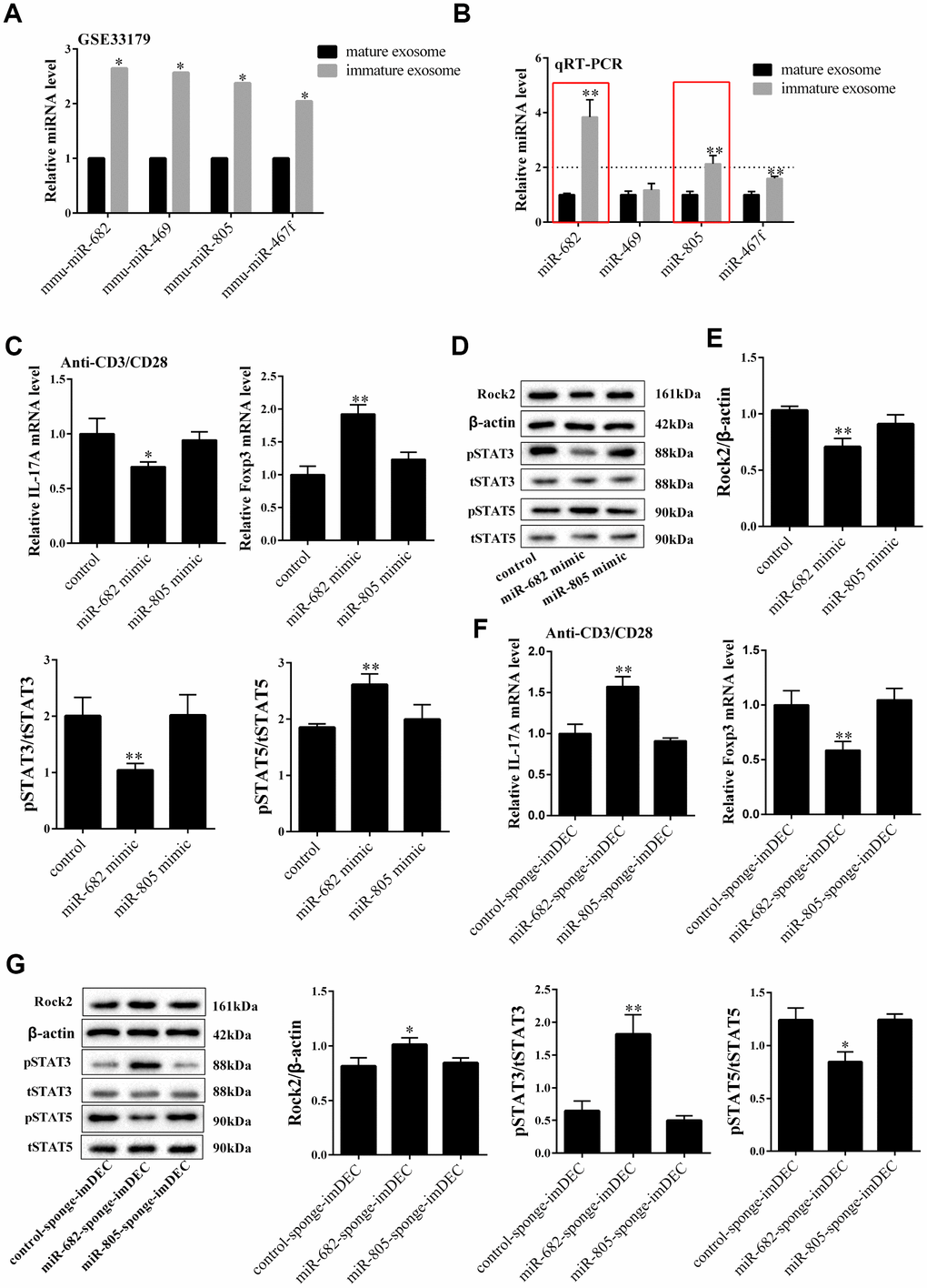 According to the information of GSE33179, the expressions of miR-682, miR-649, miR-805 and miR-467f were higher in imDEC than mDEC (Figure 4A). qRT-PCR showed that miR-682 and miR-805 were highly expressed in imDEC than mDEC (Figure 4B). Under anti-CD3/CD28 activated condition, miR-682 overexpression significantly decreased mRNA level of IL-17A and increased mRNA level of Foxp3, which had similar effect as imDEC (Figure 4C). However, miR-805 overexpression did not change the mRNA level of IL-17A and Foxp3. Besides, miR-682 mimic down-regulated ROCK2 and p-STAT3 expressions, and up-regulated p-STAT5 expression (Figure 4D and 4E). Under anti-CD3/CD28 activated condition, miR-682-sponge-imDEC promoted mRNA level of IL-17A and inhibited mRNA level of Foxp3 (Figure 4F). In addition, miR- 682-sponge-imDEC significantly promoted ROCK2, p-STAT3 expression, and decreased p-STAT5 expression (Figure 4G). However, miR-805-sponge-imDEC didn’t significantly change the expressions of ROCK2, p-STAT3 and p-STAT5. These findings indicated that miR-682 might be a mediator of imDEC regulating T cell differentiation.