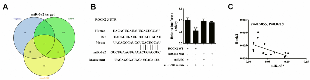 Luciferase report gene vectors (pRL-TK, Promega) containing 400ng ROCK2 Wild Type (WT) or 400 ng ROCK2 mutant (Mut) were transfected into 293T cells. miR-682 mimic or negative control (miRNC) were co-transfected with reporter plasmids for 48 h. 293T cells were collected to measure luciferase activity by Dual-Luciferase Reporter Assay System (Promega).