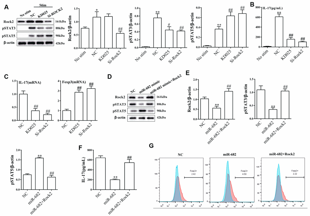 Under Th17 polarization stimulation, si-ROCK significantly suppressed the expression of ROCK2. KD025 (ROCK2 selective inhibitor) and small interference RNA targeting ROCK2 (si-ROCK2) significantly decreased the expression of p-STAT3 and increased the expression of p-STAT5 (Figure 6A). Moreover, KD025 and si-ROCK2 significantly decreased IL-17 secretion and mRNA level, and increased Foxp3 mRNA level (Figure 6B and 6C). miR-682 mimic down-regulated the expression of ROCK2 and p-STAT3, inhibited IL-17 secretion, up-regulated the expression of p-STAT5, and promoted the percentage of Foxp3+CD4+T cells (Figure 6D–6G). And overexpression of ROCK2 could reverse the effect of miR-682 on the regulation of T cell differentiation (Figure 6D–6G).