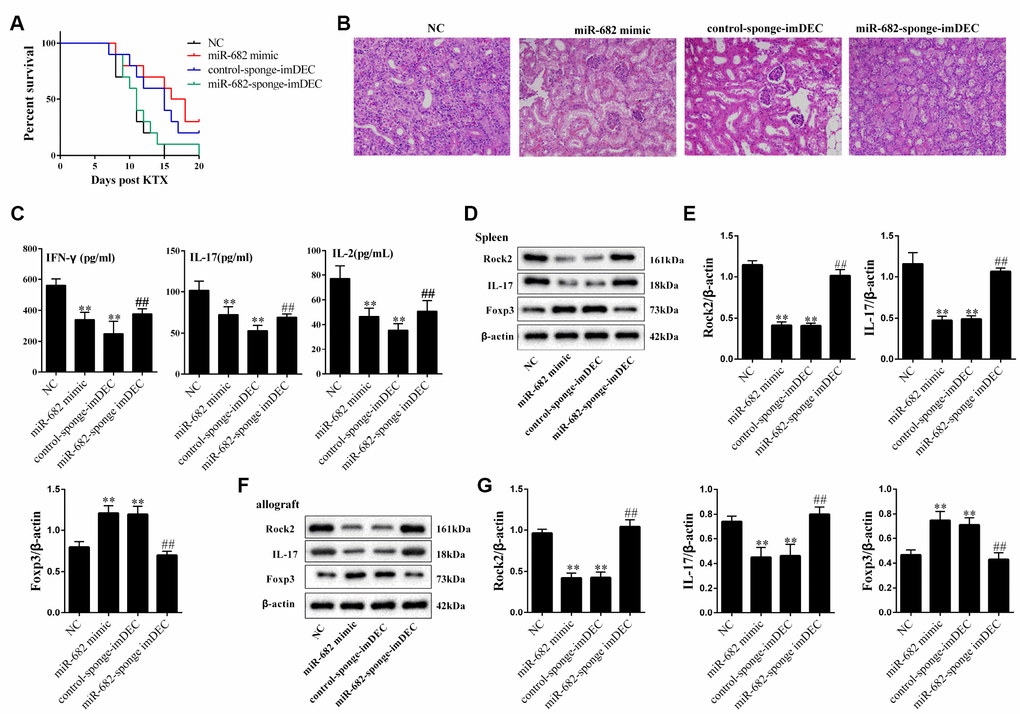 To demonstrate the effect of imDEC-derived miR-682 on survival rate, 10 μg control-sponge-imDEC, miR-682-sponge-imDEC or miR-682 mimic was injected into the allograft model mice via the tail vein 24 hours before and after transplantation (ten mice in each group). We found that the survival rate in miR-682-sponge-imDEC group was lower than control-sponge-imDEC group, and the survival rate in miR-682 mimic group and control-sponge-imDEC group was higher than NC group (Figure 7A). H&E and CD4 staining showed that the remission effect of miR-682-sponge- imDEC on renal inflammation indicating that imDEC could regulate acute rejection after kidney transplantation through miR-682 (Figure 7B). In addition, serum IL-2, IL-17 and IFN-γ levels were significantly reduced in miR-682 mimic group and control-sponge-imDEC group, whereas miR-682-sponge-imDEC increased serum IL-2, IL-17 and IFN-γ levels compared with control-sponge-imDEC (Figure 7C). We further extracted the proteins of T cells from the spleen and allograft kidney tissues, and detected the ROCK2, IL-17 and Foxp3 expressions. The effect of miR-682-sponge-imDEC on inhibiting IL-17 and promoting Foxp3 was reduced (Figure 7D–7G).
