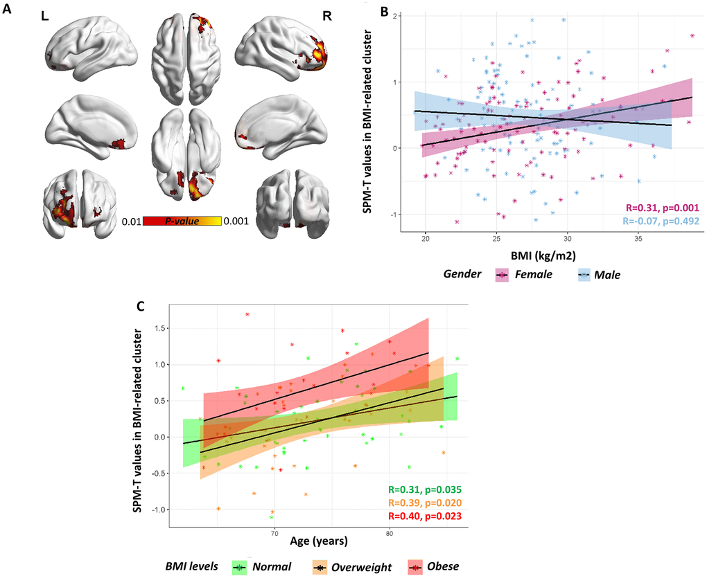 Only few studies investigated obesity-related changes in brain metabolism in healthy adults [12]. For example, Volkow et al. [13] reported a negative correlation between Body Mass Index (BMI) levels and brain metabolism of prefrontal cortex and cingulate gyrus in a group of young and healthy subjects. Wang et al. [14] reported higher metabolic activity in obese than lean subjects in postcentral gyrus of the parietal cortex. However, to the best of our knowledge, the relation between BMI levels and brain metabolic changes in heathy elderlies has not been explored yet.