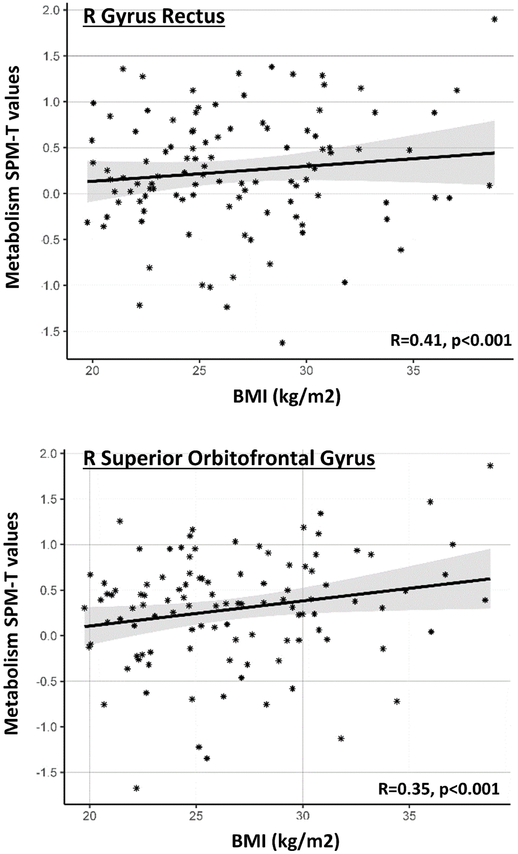At consistence with the voxel-based analysis, post-hoc analysis using ANCOVA revealed a significant BMI x gender interaction on metabolism of the right superior orbitofrontal gyrus (F=6.47, p=0.012), suggesting that the effect of BMI on orbitofrontal metabolism is significantly stronger in females as compared to males (Table 2). We also found that age significantly predicted metabolism in the orbitofrontal cortex (left and right superior orbitofrontal gyrus, right middle orbitofrontal gyrus: F=6.09; 15.57; 8.66; p=0.009, 0.000, 0.004, respectively) and right gyrus rectus in the female cohort; still, no significant BMI x age interaction was found in these regions (p<0.05). This confirms that age and BMI are both significant and independent predictors of metabolic function in the orbitofrontal regions.