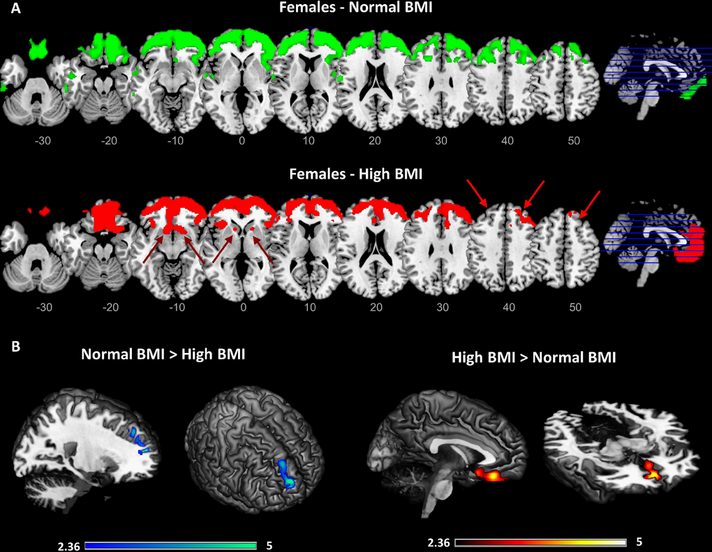 The gender difference demonstrated here in the association between BMI and brain metabolism brings several considerations for medical practice and health policy, considering that the neurophysiological mechanism(s) via which the reward circuits are different in males and female. It is conceivable that the difference relies on genetic and/or environmental factors. Genetic determinants for a gender difference in brain connectivity are likely to be mainly linked to sex chromosome variance. fMRI studies on girls with Turner syndrome and attention deficit hyperactivity disorder suggest a role of X-monosomy in affecting brain attention networks and cognitive function [32]. Furthermore, women with Complete Androgen Insensitivity Syndrome (CAIS), i.e. having a male karyotype (46, XY) but no functional androgen receptors, show lack of masculinization of the human brain [33]. Concerning phenotypical characteristics, administration of testosterone to middle-aged women diminished orbitofrontal cortex activity and its effective connectivity with the amygdala [33]. Vice versa, administration of estrogens to middle-aged postmenopausal women, is reported to increase the amygdala-prefrontal cortex connectivity [34] and enhance prefrontal cortex activity during cognitive control tasks [35]. Estrogen levels have also been shown to modulate response of brain regions that process emotion and reward signals, as measured by fMRI, in pre-menopausal women [36]. The development of central resistance to the effect of insulin, leptin as well as other hormones effective on energy metabolism and chronically altered in obesity may also explain the BMI-related differences in brain glucose metabolism [37, 38].