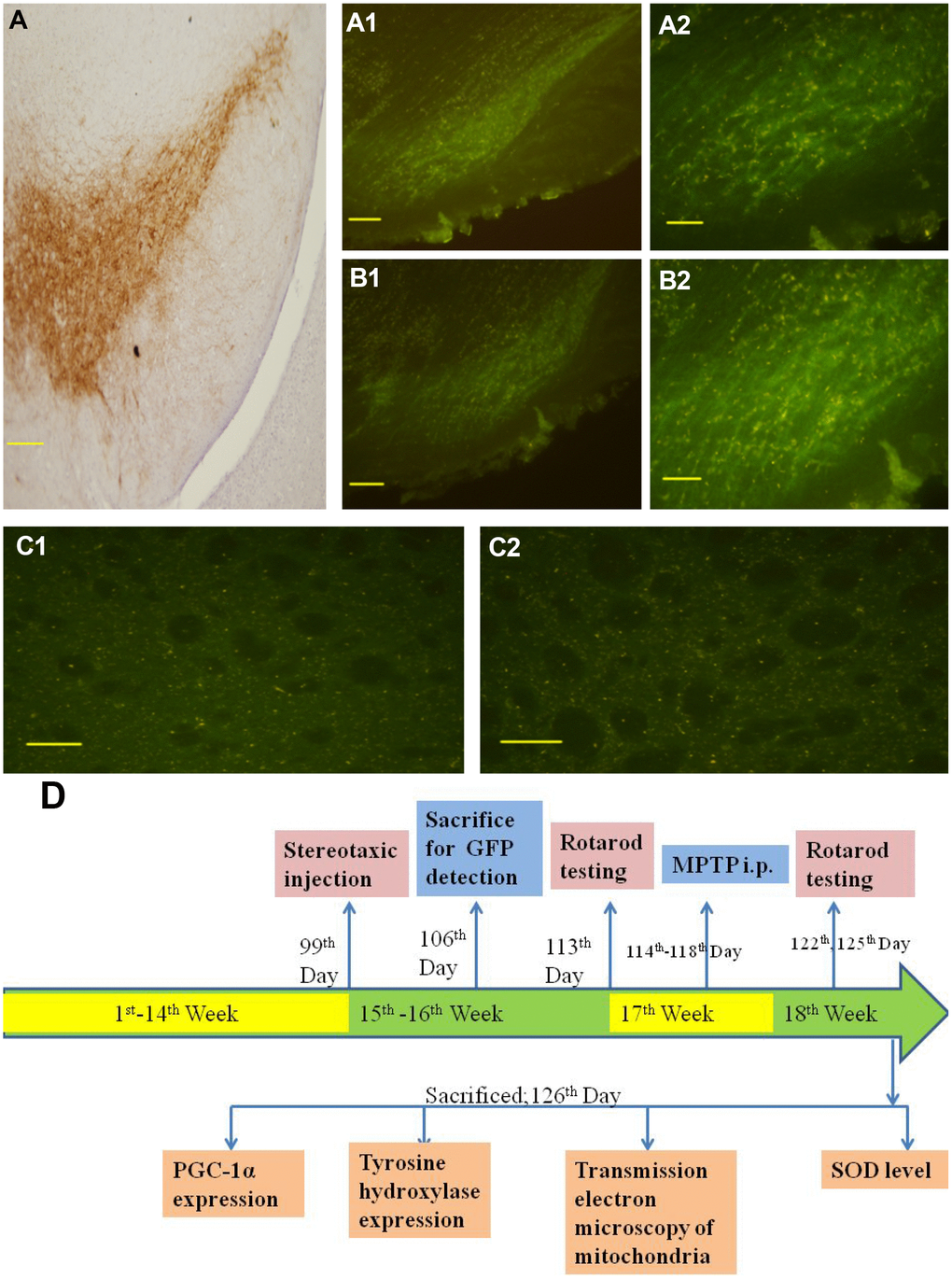 The primary aim of the present study was to attain a better understanding of the role of PGC-1α in the SN of an MPTP-treated dopaminergic neurotoxicity model, with a particular focus on beneficial effects against SN neuronal loss and mitochondrial dysfunction.