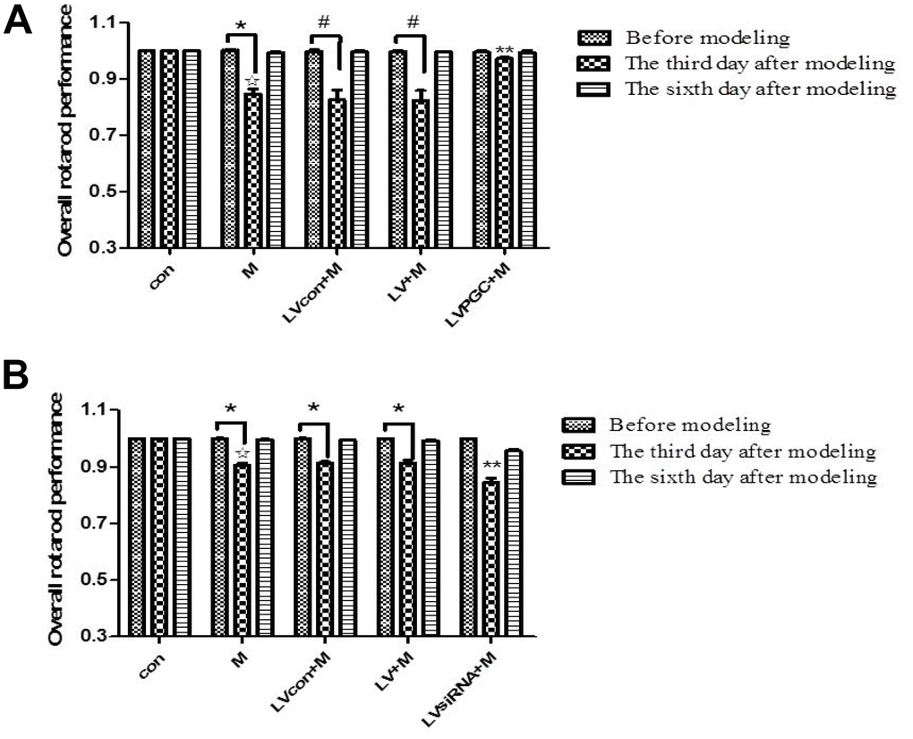 Mice were randomly assigned to the following groups (n=24 per group): normal saline (NS) intraperitoneal injection (i.p.) (con); MPTP i.p. (M); Solvent of lentivirus (lentivirus control) striatal injection + MPTP i.p. (LVcon+M); Lentivirus striatal injection + MPTP i.p. (LV+M); LV-PGC-1α striatal injection + MPTP i.p. (LVPGC+M); and LV-PGC-1α-siRNA striatal injection + MPTP i.p. (LVsiRNA+M). Intraperitoneal injections of MPTP/NS were conducted two weeks after lentivirus injection.