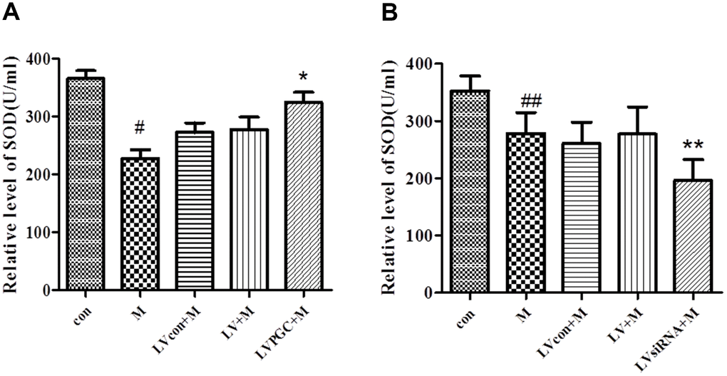 The WST-1 method was used to measure SOD concentration in SN homogenates from each group. In the overexpression studies (Figure 6A, Table 1), the levels of SOD induced by MPTP were 27.60% lower than those in the con group (P<0.01), while those in the LVPGC+M group were 17% higher than those in the LV+M group (P<0.01). In the knockdown studies (Figure 6B, Table 1), the SOD level showed a 21.15% decrease in the SN region after MPTP treatment compared with that in the con group (P<0.05). The SOD level in the LVsiRNA+M group was 29.26% lower than that in the LV+M group (P<0.05). The data above showed that MPTP treatment reduced total SOD activities, and the expression levels of PGC-1α determined the SOD activities.