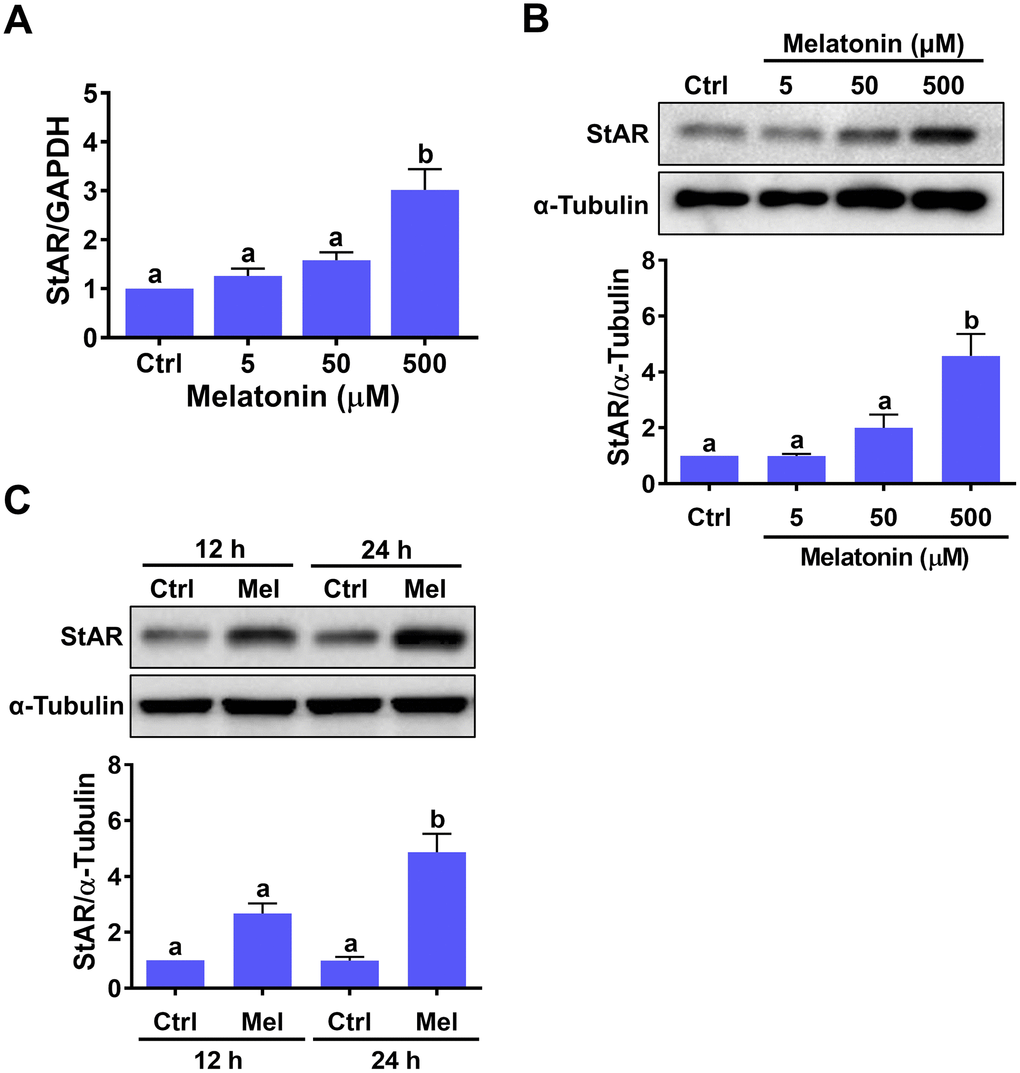 To examine the effect of melatonin on StAR expression, hGL cells isolated from follicular aspirates of women undergoing oocyte retrieval during IVF treatment were treated with different concentrations of melatonin for 24 h. While 5 or 50 μM melatonin had no significant effects, StAR mRNA levels were significantly upregulated by exposure to 500 μM melatonin (Figure 1A). Western blot results confirmed the stimulatory effects of melatonin on StAR at the protein level (Figure 1B). Time-course expression experiments revealed that 12 h melatonin treatment caused a slight, non-significant upregulation of StAR protein levels, while significant upregulation was observed after 24 h of treatment (Figure 1C).