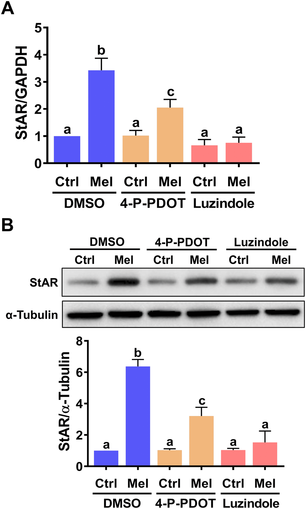 To identify the cellular receptor(s) involved in melatonin-induced StAR expression in hGL cells, two melatonin receptor antagonists, 4-P-PDOT (MT2-selective) and luzindole (MT1/MT2-nonselective), were tested [29]. As shown in Figure 2A, none of these inhibitors affected basal StAR mRNA levels. However, in the presence of melatonin, StAR mRNA upregulation was partially inhibited by pre-treatment with 4-P-PDOT, and abolished by pre-treatment with luzindole. Furthermore, western blot analyses showed that these antagonists also reduced StAR protein expression (Figure 2B). These results indicate that both MT1 and MT2 mediate melatonin-induced upregulation of StAR expression in hGL cells.