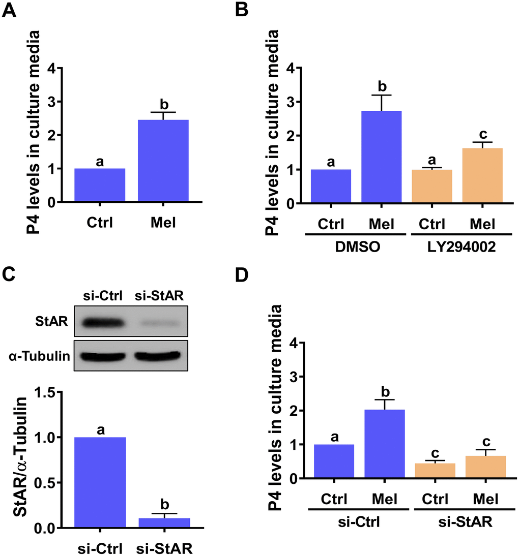Given the critical role of StAR in the regulation of P4 production, we examined the effect of melatonin on the production of P4 in hGL cells. ELISA showed that hGL cells stimulated with melatonin released P4 into the culture medium (Figure 4A), and that this effect was attenuated by inhibition of the PI3K/AKT signaling pathway (Figure 4B). To directly examine the requirement of StAR for melatonin-stimulated P4 production, a siRNA-based gene silencing approach was used to knockdown StAR expression. Transfection of hGL cells with StAR siRNA for 48 h significantly downregulated endogenous StAR protein levels (Figure 4C), downregulated basal P4 expression, and abolished melatonin-stimulated P4 secretion (Figure 4D).